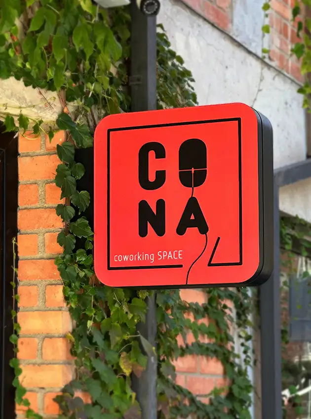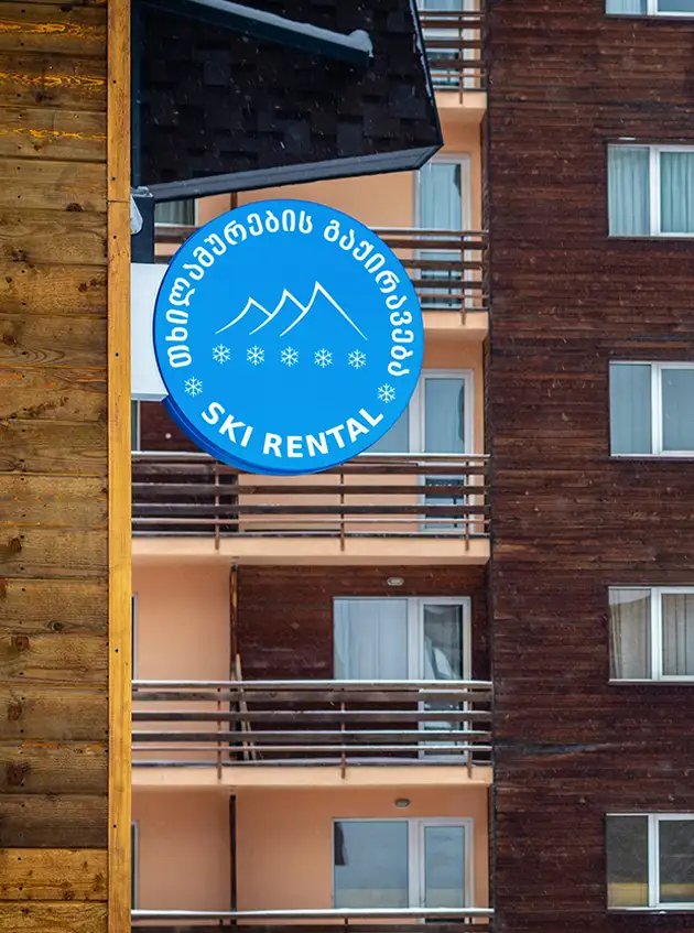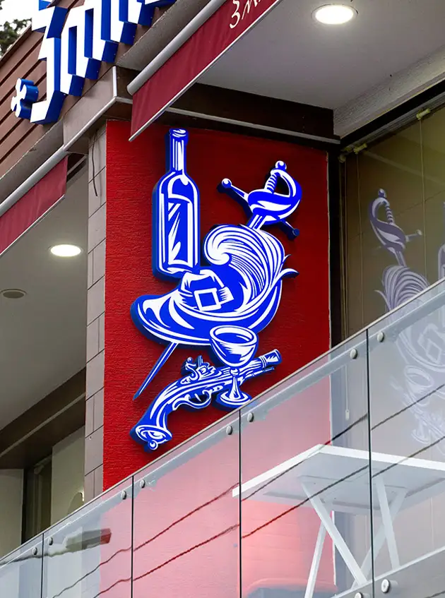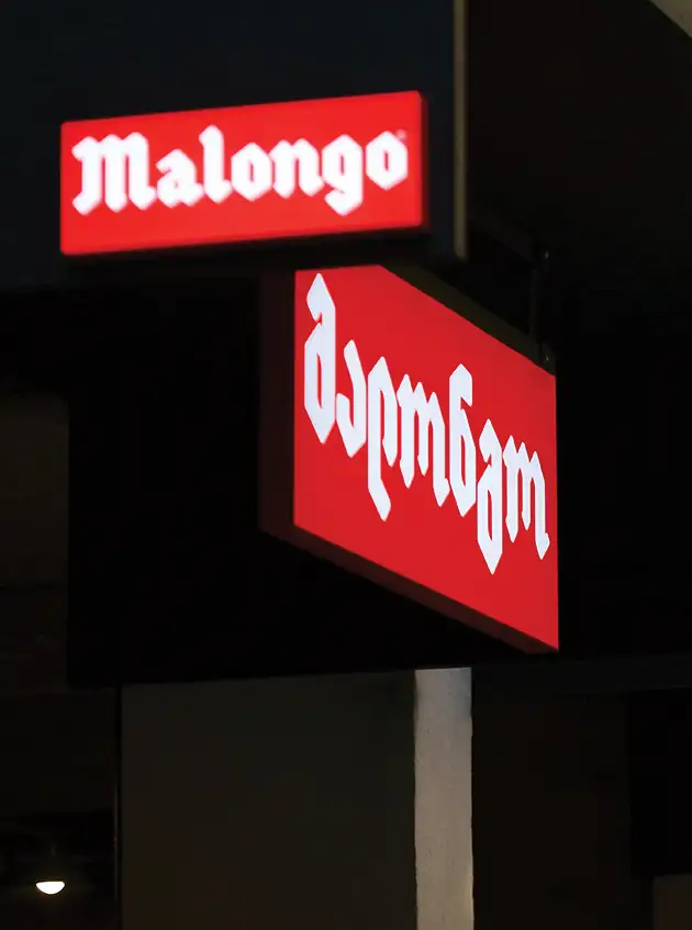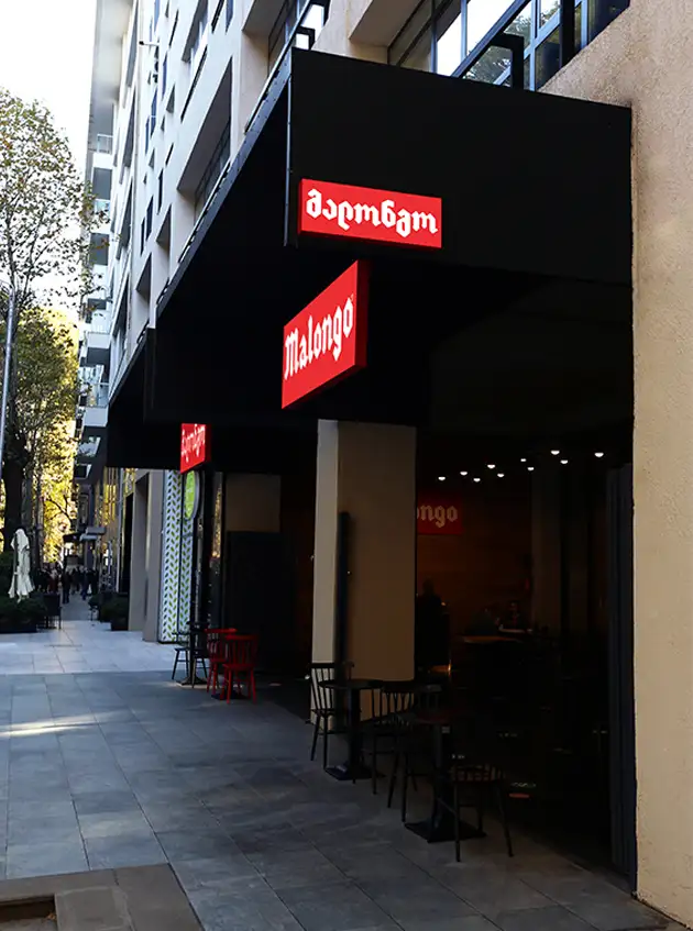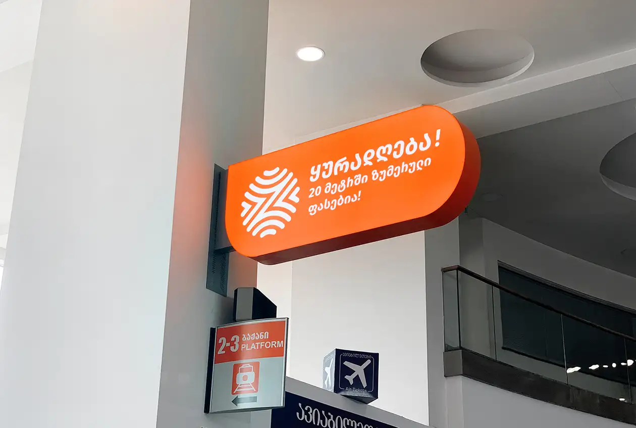 შესასვლელის თავზე დამონტაჟებული ორგმინის აბრების მაგალითები ლაითბოქსის სტილში