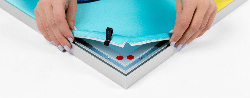 ინტერიერში Textile Frame-ის გამოყენებით ვიტრინები, კედლები, ჭერი და სხვა დიდი თუ პატარა ფორმატის სივრცეები ფორმდება.